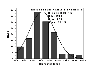 تصاویر میکروسکوپ الکترونی پویشی (SEM)، و توزیع قطری نانوالیاف الکتروریسی شده PLGA در شکل 2 نشان داده شده است. همچنین به طور واضح ملاحظه میشود که نانو الیاف بدون عیوب ساختاری (بید) تولید شده است.