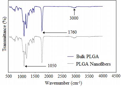 طیف سنجی مادون قرمز (FTIR) نانوالیاف الکتروریسی شده PLGA و پلیمر آن در شکل 3 نشان داده شده است. پیکهای ارتعاشی هر دو طیف در cm-1 1760 و cm-11050به ترتیب مربوط به کشش C=O و C–O است. پیک نزدیک cm-1 3000 به علت گروههای آلکیل ظاهر شده است.